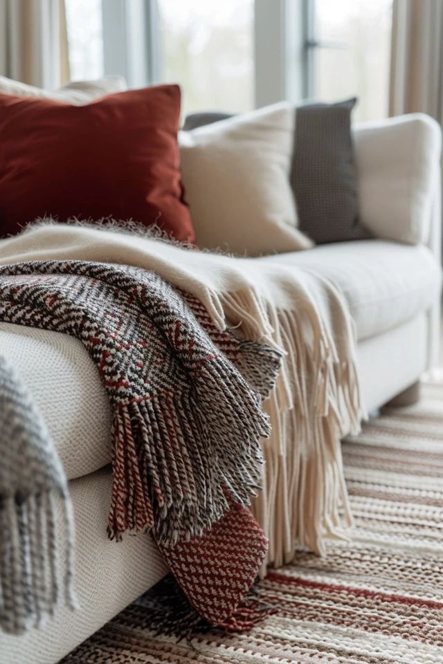Бросайте пледы свободно, не выравнивайте и не создавайте форму. Можно сочетать плотные и тонкие пледы вместе.