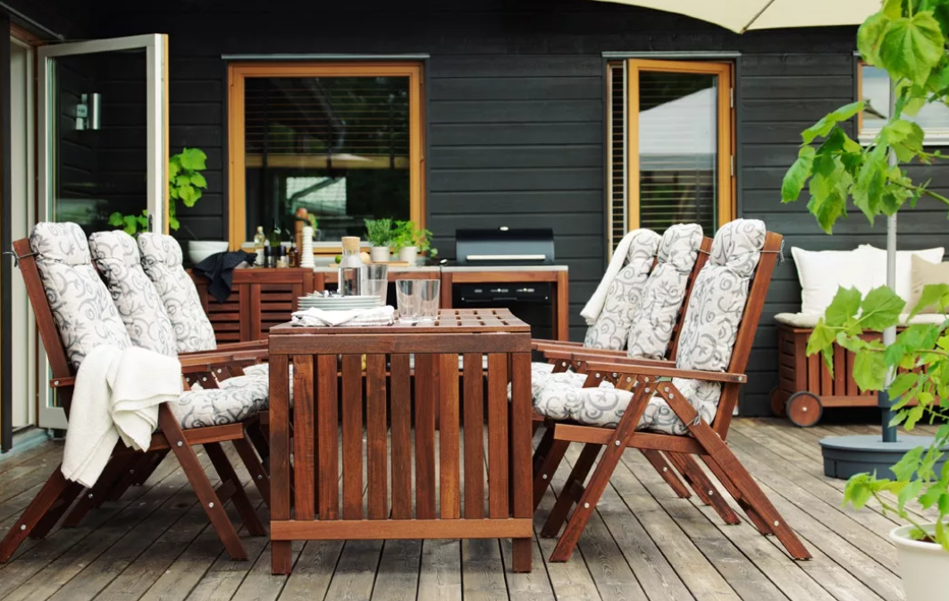 Для обедов — столовые гарнитуры, для релакса — диваны и шезлонги, для уединения — подвесные кресла. На маленьких участках выручат складные модели.