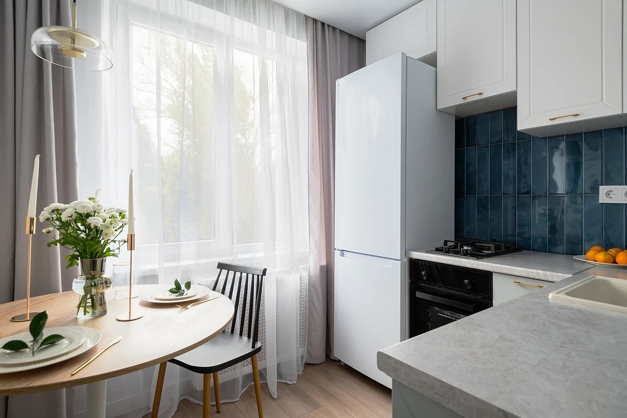 Оптимальное место для холодильника — прохладный угол кухни. Между стенами и мебелью стоит оставить 5–7 см, чтобы воздух свободно циркулировал.