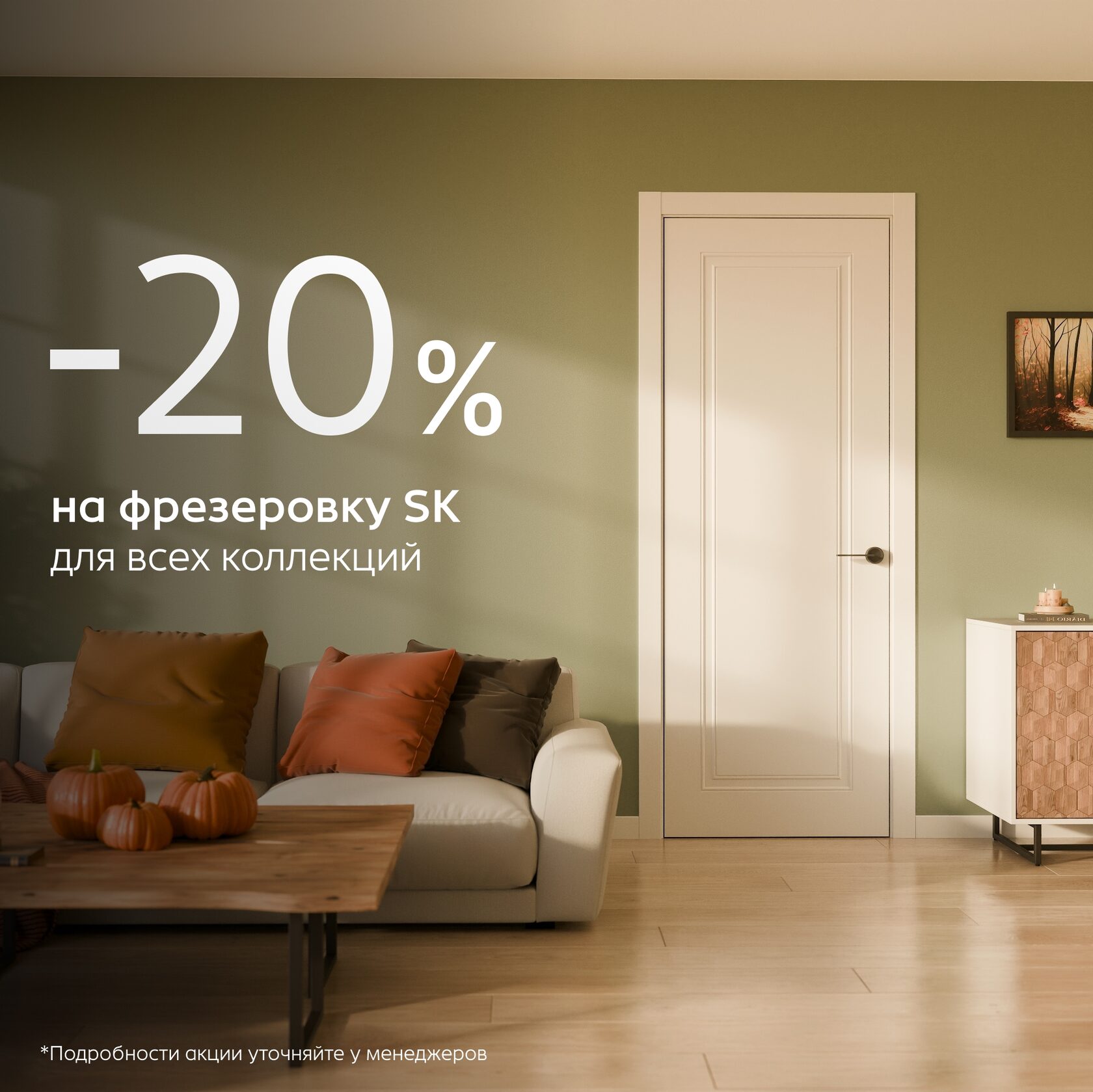 В этот период вы можете заказать двери в любых декоративных покрытиях с элегантной фрезеровкой SK со скидкой 20%.